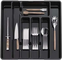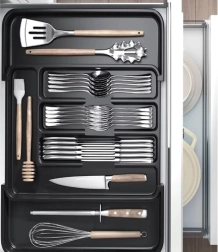 Maximizează spațiul din sertar datorită designului extensibil inteligent. Organizatorul se reglează fluent pentru diferite lățimi de sertare, astfel încât tacâmurile, cuțitele și lingurile de gătit vor fi întotdeauna depozitate clar. Construcția rezistentă din PP asigură durată lungă de viață, rezistență la zgârieturi și întreținere ușoară.