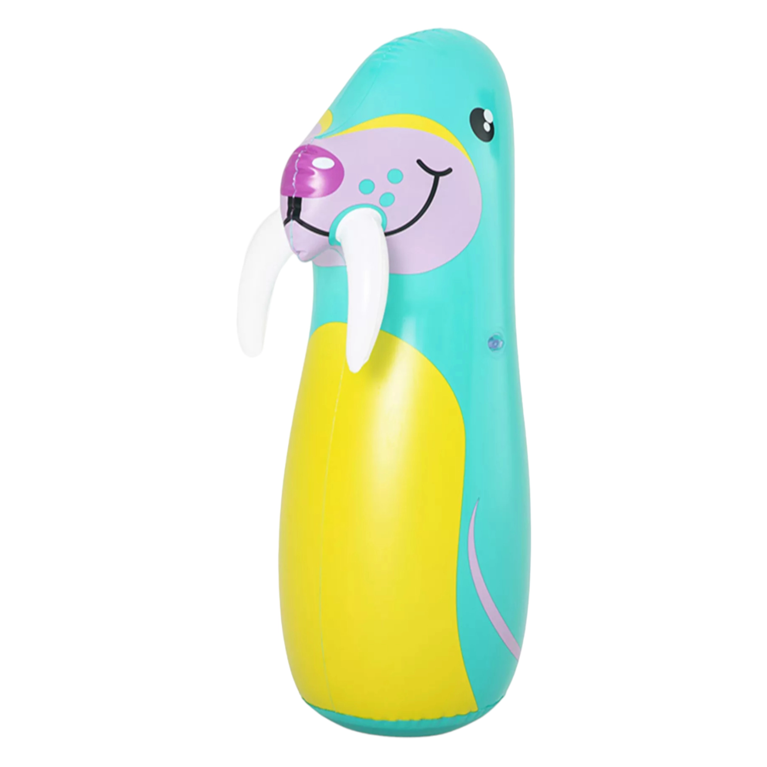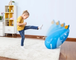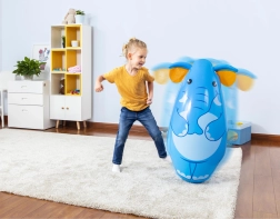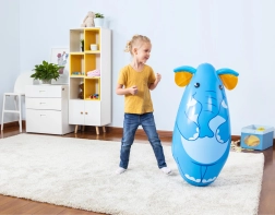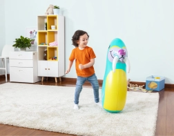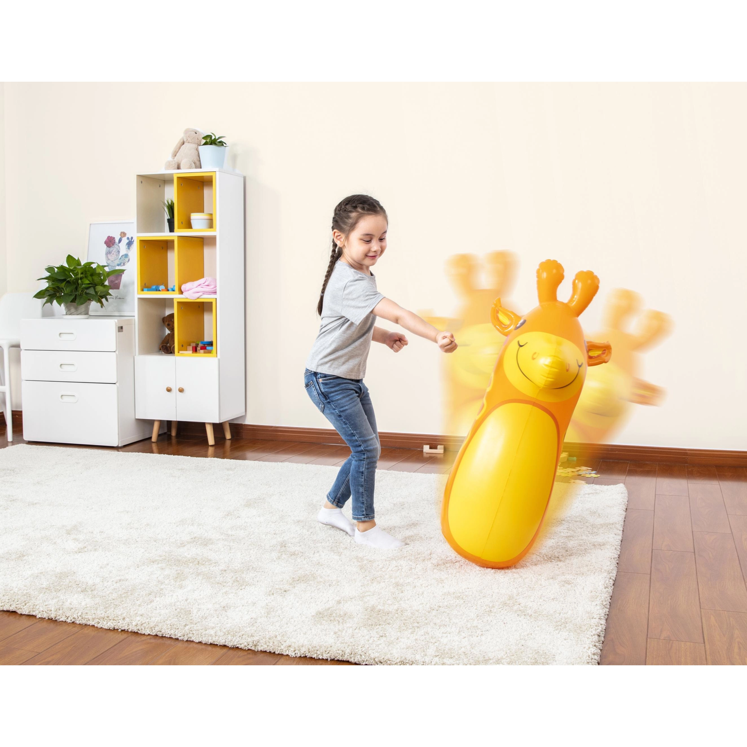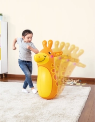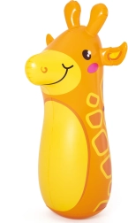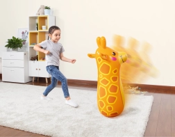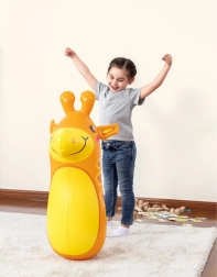 Sacul de box gonflabil – girafă este ideal pentru copiii activi de la 3 ani. După umplerea camerei inferioare cu apă, după fiecare lovitură sau șut se redresează automat, încurajând mișcarea și antrenând echilibrul, viteza și coordonarea mână–ochi. Designul vesel al girafei motivează la joacă și înseninează orice cameră de copil.