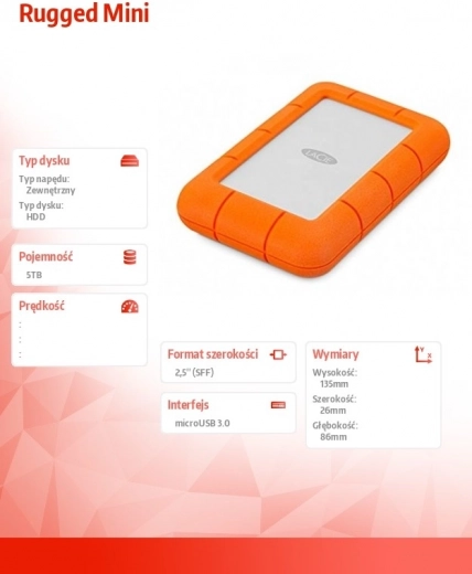 LaCie Rugged Mini este cel mai compact membru al familiei Rugged, conceput pentru utilizatorii care au nevoie de capacitate mare și fiabilitate maximă pe teren. Datorită construcției robuste cu strat din cauciuc, rezistă provocărilor zilnice, ploii și presiunii ridicate, păstrând totodată dimensiunile mobile ale unui disc de 2,5".