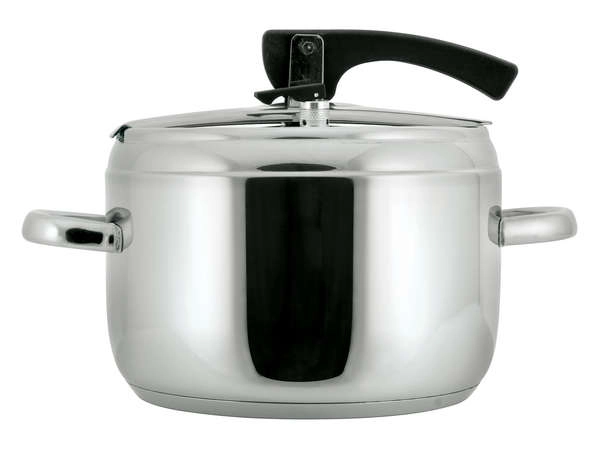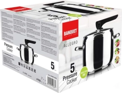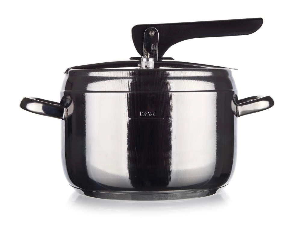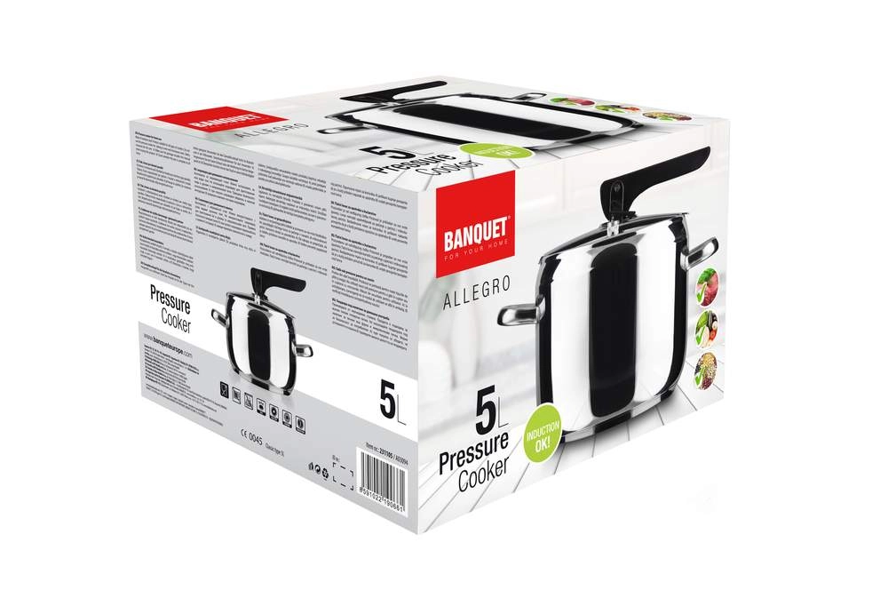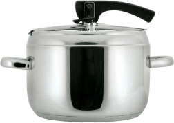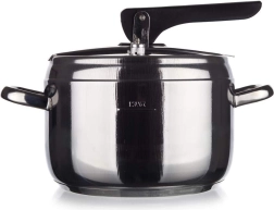 Oală sub presiune din inox de 5 l cu închidere cu pârghie, diametru 20,8 cm, înălțime 15 cm, oțel inoxidabil 18/0, grosimea peretelui 0,6 mm, 2 valve, fund tip sandwich robust. Capacul include două valve: valva principală de funcționare și valva auxiliară/de siguranță. Oala sub presiune este destinată preparării rapide a mâncărurilor și poate fi utilizată pe toate tipurile de plite, inclusiv pe inducție. Capacul oalei sub presiune conține valva principală de funcționare și o valvă auxiliară pentru cazul înfundării valvei principale, făcând vasul extrem de sigur! Oala sub presiune este realizată din material rezistent, are un fund gros și poate fi folosită pe toate tipurile de plite.