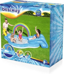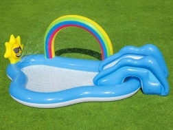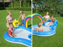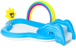 Acest teren de joacă acvatic este alegerea perfectă pentru copiii pe timpul verii. Datorită combinației prietenoase cu poarta curcubeului și soarele, copiii dvs. se vor bucura de ore de distracție în apa răcoritoare. Multifuncționalitatea piscinei nu doar că oferă un adăpost răcoritor împotriva căldurii de vară, dar aduce și râsete și bucurie datorită multitudinii de funcții.