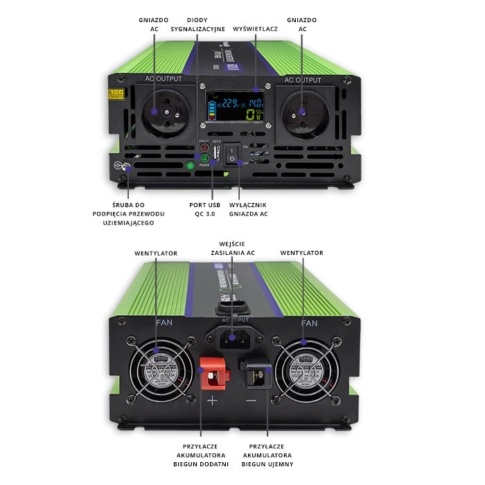Datorită echipamentelor precum prizele AC, portul USB și afișajul LCD, acest convertor este un ajutor excelent pentru alimentarea și încărcarea dispozitivelor dumneavoastră.