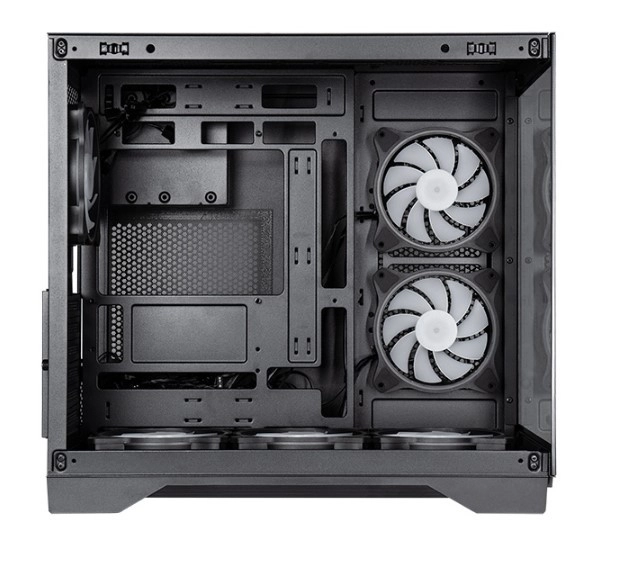 Include 6× ventilatoare ARGB de 120 mm și un hub de control cu posibilitatea de sincronizare ARGB și reglare a turațiilor prin placa de bază. Cinci ventilatoare au pale pentru flux invers, asigurând aport optim de aer din laterale și partea de jos, fără a compromite aspectul curat al sistemului.