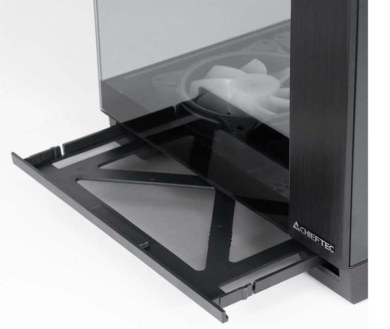 CHIEFTEC Visio GM-30B este o carcasă mid‑tower premium proiectată pentru management curat al cablurilor, flux de aer excelent și prezentare atractivă a componentelor. Cele două panouri mari din sticlă temperată împreună cu panoul frontal pun în valoare iluminarea ARGB integrată și componentele de top, în timp ce designul cu două camere ascunde cablurile și sursa în afara camerei principale.