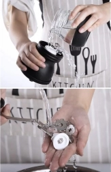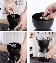 Dotarea practică include 2 recipiente din sticlă de 120 g cu capace pentru păstrarea prospețimii, o manivelă metalică pentru o măcinare lină și o bază din silicon antiderapant pentru stabilitate pe blatul de lucru. Părțile din sticlă pot fi spălate în mașina de spălat vase, restul se curăță ușor manual.