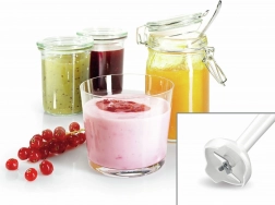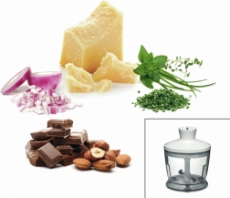 Pachetul include un tocător universal care toacă instant ierburi, ceapă, nuci, ciocolată și brânzeturi tari – ideal pentru pesto și salsa de casă. Recipientul de mixare cu gradații asigură dozarea precisă a ingredientelor. Datorită designului anti-stropire al piciorului, lucrul este curat și fără mizerie, iar piesele selectate pot fi spălate în mașina de spălat vase pentru întreținere facilă.