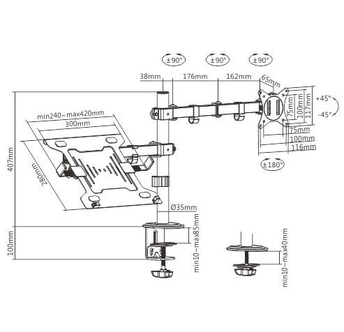 Clema de prindere robustă (clamp) se fixează sigur de blatul mesei, iar clemele practice te ajută să gestionezi cablurile. Compatibilitatea cu VESA 75×75 și 100×100 mm asigură o instalare fără probleme pentru aproape orice monitor LCD de până la 32″, în timp ce platforma susține în siguranță un laptop de până la 15,6″.