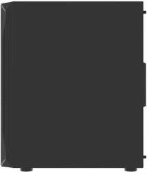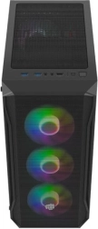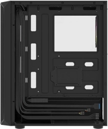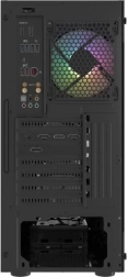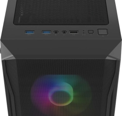Panoul I/O superior include esențialul: 2× USB 3.0, 1× USB 2.0, HD Audio 3,5 mm pentru căști și microfon, butoane Power/Reset și LED-uri de stare. Sticla temperată pe panoul lateral stâng evidențiază componentele și efectele RGB, în timp ce filtrele de praf dese mențin interiorul curat pe termen lung.