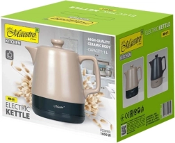 Fierbătorul electric ceramic MAESTRO, cu volum de 1 l și putere de 1200 W, oferă un design elegant și întreținere ușoară. Corpul ceramic păstrează căldura și reduce depunerile de calcar, baza rotativă la 360° facilitează manevrarea, iar întrerupătorul iluminat împreună cu oprirea automată sporesc siguranța. Include indicator MAX la interior, element de încălzire ascuns și compartiment pentru cablu.