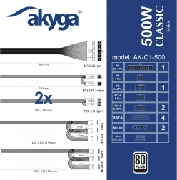 Sursă ATX Akyga 500 W din seria Classic, cu certificare 80 PLUS, oferă putere stabilă de 500 W, un ventilator silențios de 120 mm, protecții moderne OVP/UVP/SCP/OPP/OCP/OTP și cablu plat pentru o gestionare curată a cablurilor și un airflow mai bun.