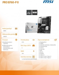 MSI PRO B760-P II este o bază fiabilă pentru stații profesionale și PC-uri de acasă performante. Suportă procesoarele Intel Core generațiile 14./13./12. și oferă o lățime de bandă mai mare a memoriei datorită DDR5 dual-channel. PCB-ul de calitate cu 6 straturi, cupru 2 oz și componente premium contribuie la durată de viață lungă și funcționare stabilă.
