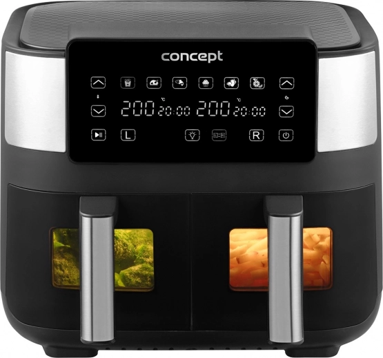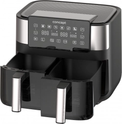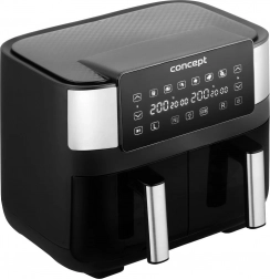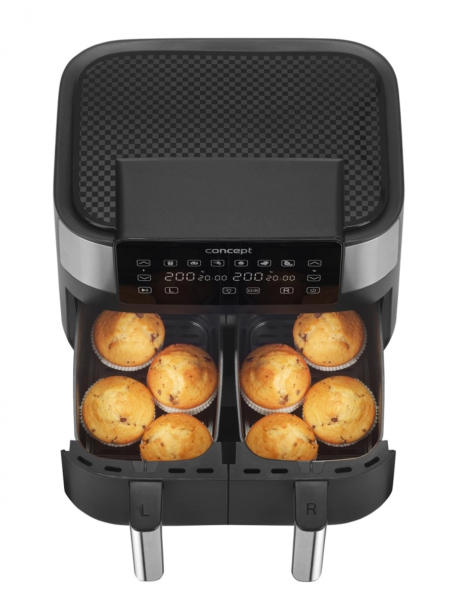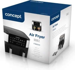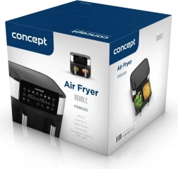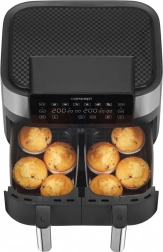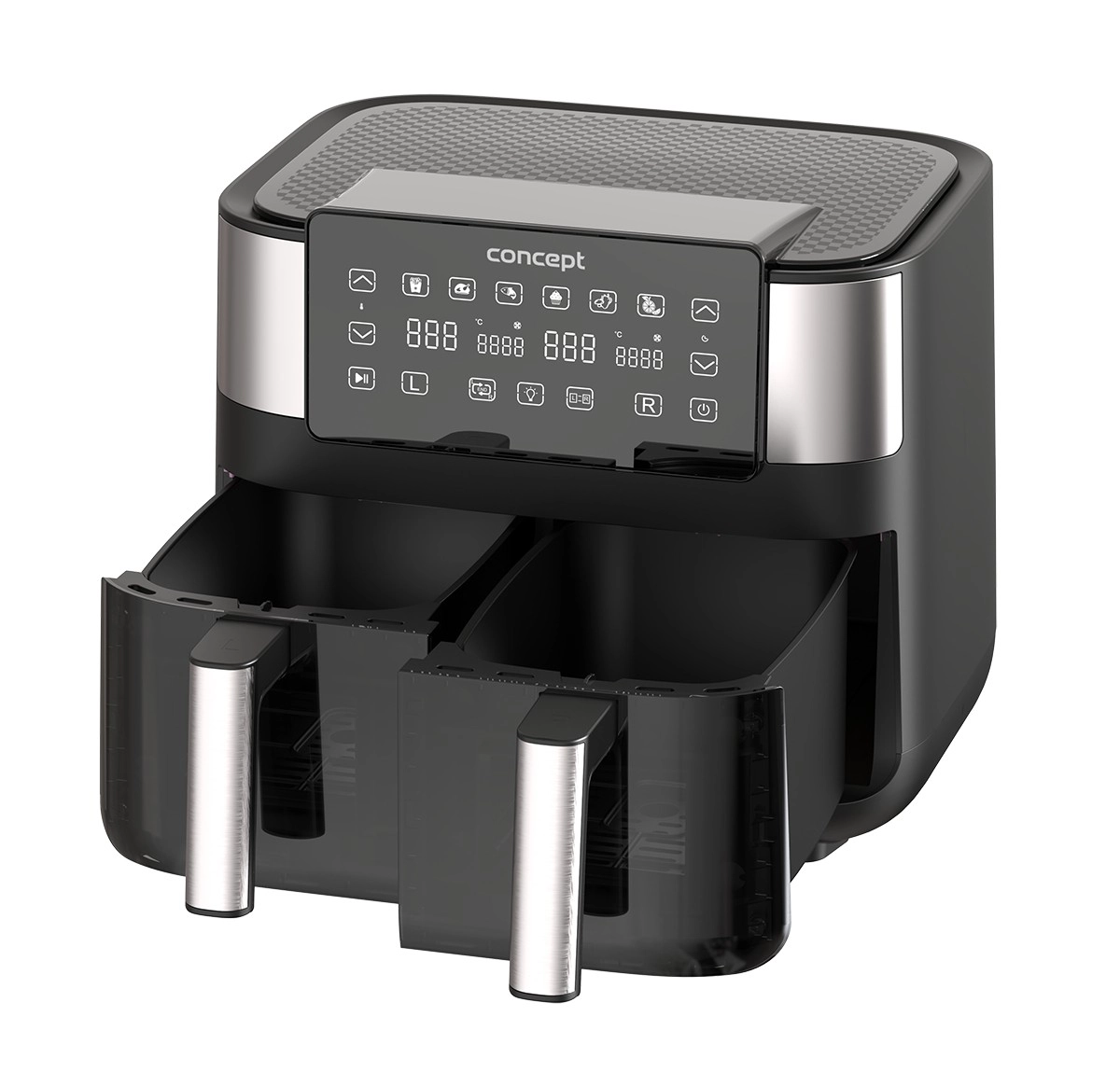 Friteuza cu aer cald cu sertar dublu permite o gătire rapidă, crocantă și mai sănătoasă datorită circulației aerului fierbinte. Cu o cantitate minimă de ulei, obții rezultate excelente fără mirosuri și fără dezordinea prăjirii tradiționale. Datorită celor două coșuri de 4 litri, poți pregăti simultan două feluri diferite fără amestec de arome.