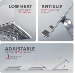 Bucurați-vă de un mediu de lucru confortabil cu un suport compact și portabil, care vă îndeplinește nevoile, fie că lucrați acasă, la birou sau în deplasare. Acest suport este realizat din turnări din aluminiu durabile, care îi asigură o durată de viață îndelungată și fiabilitate. Datorită finisajului antiderapant, nu trebuie să vă faceți griji cu privire la mișcările nedorite; dispozitivul dumneavoastră va rămâne ferm pe poziție, fără a deteriora suprafața laptopului sau a biroului.