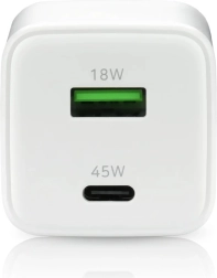 Două ieșiri – USB‑C PD/PPS 45 W și USB‑A QC4+ – vă permit să încărcați flexibil diverse dispozitive. Intervalul larg de intrare 100–240 V / 50–60 Hz garantează utilizarea la nivel mondial. Construcția cu eficiență ridicată îndeplinește standarde energetice exigente și minimizează încălzirea și consumul în regim standby.