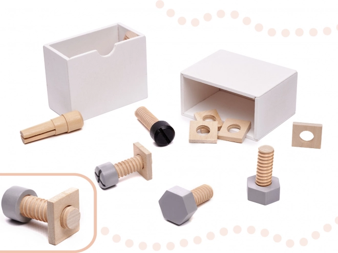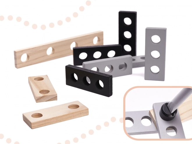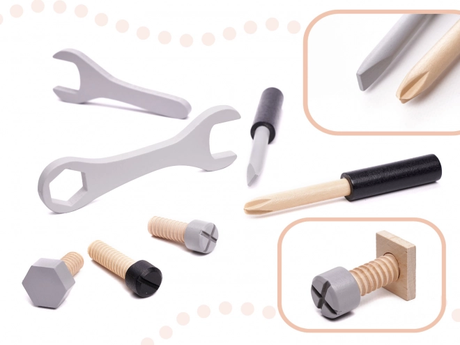 Marele set de lemn va fi visul împlinit al fiecărui mic meșteșugar. Șurubelnițe, ciocan, șuruburi, chei - toate elementele necesare într-un atelier profesionist. O bucurie imensă pentru copil va fi posibilitatea de a găuri, ciocăni și tăia fără limită. Cutia de lemn cu mâner face întregul set mobil, astfel încât copilul să poată lua sculele cu el pentru orice problemă urgentă.<'p>Specificații tehnice:<'/strong><'/p> Setul conține:<'/strong><'/p>