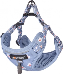 Ușor, moale căptușit și reglabil, hamul se adaptează cu ușurință corpului câinelui. Fixarea sigură este asigurată de un inel metalic și o carabină fiabilă. Finisajul modern, în albastru deschis, cu un discret model floral, adaugă stil plimbărilor tale.