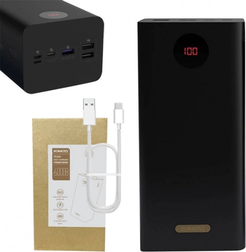 Baterie externă Romoss cu o capacitate masivă de 60000mAh și posibilitate de încărcare simultană a până la patru dispozitive datorită tehnologiilor QC și PD. Echipată cu afișaj LED pentru control facil al stării de încărcare.