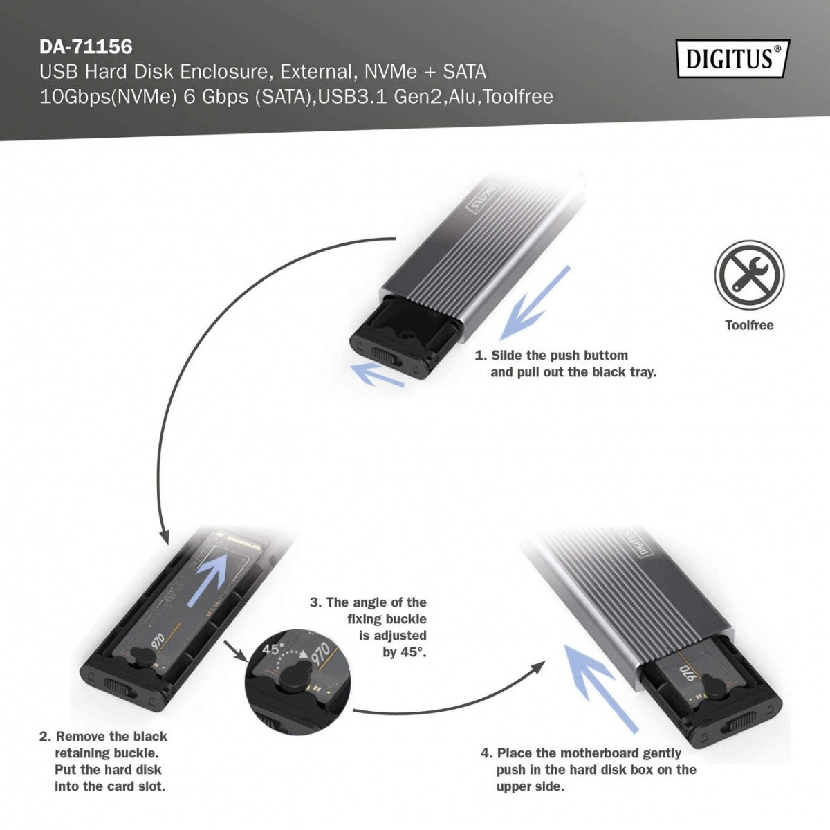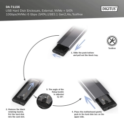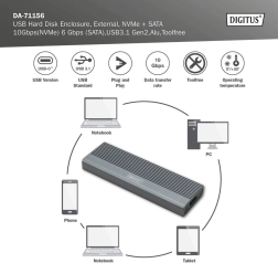 Extindeți spațiul de stocare în câteva clipe cu o carcasă compactă și rezistentă din aluminiu (Pantone 430C). Oferă transferuri de mare viteză de până la 10 Gb/s (NVMe) și 6 Gb/s (SATA), este complet plug and play și se alimentează direct din USB. Construcția fără unelte permite schimbarea rapidă a discurilor.