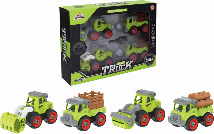 Set distractiv de mașini agricole de înșurubat pentru copii. Include 4 mașini, încărcătură și șurubelniță. Dimensiunea mașinilor 13 cm, roți libere.