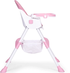 Coșul practic de sub șezut găzduiește bavete, șervețele sau jucării. După masă, scăunelul se pliază ușor cu ajutorul butoanelor laterale, economisind spațiu.