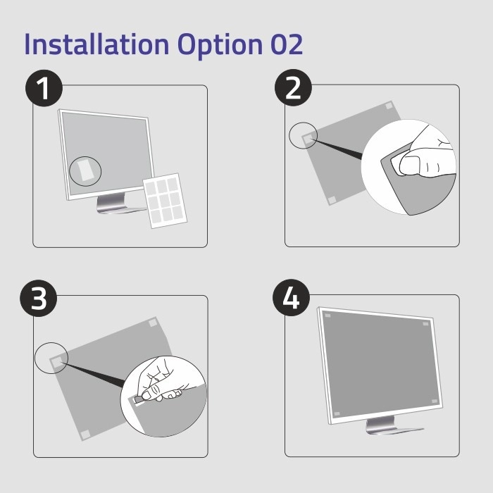 Instalare ușoară și materiale de înaltă calitate asigură că monitorul rămâne curat și neafectat. Filtrul poate fi instalat cu ușurință folosind cleme aderente la rama monitorului sau benzi transparente direct pe ecran.