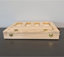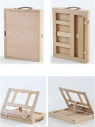 Geanta din lemn este dotată cu un sertar și un șevalet, asigurând transportul ușor și organizarea materialelor artistice.