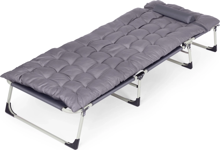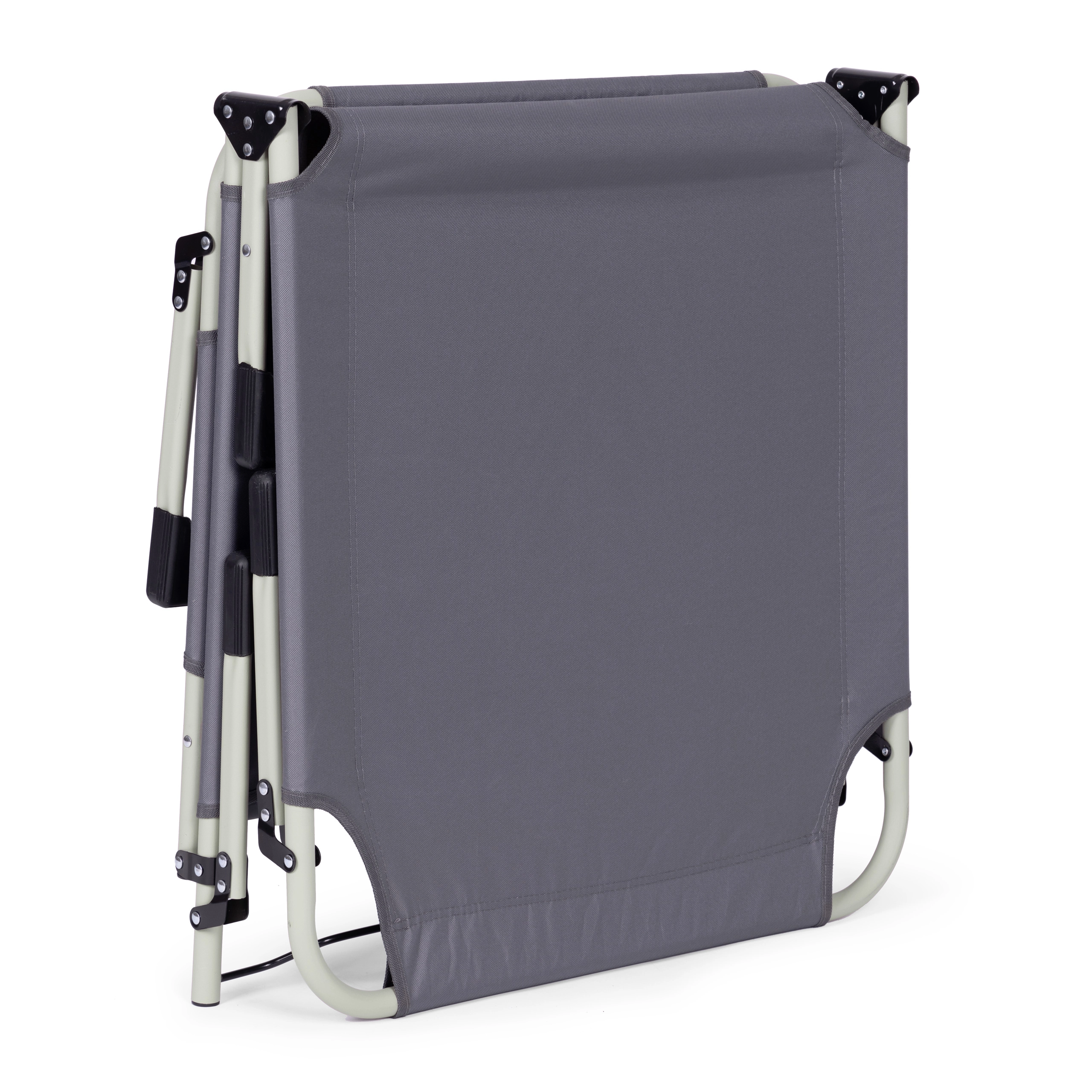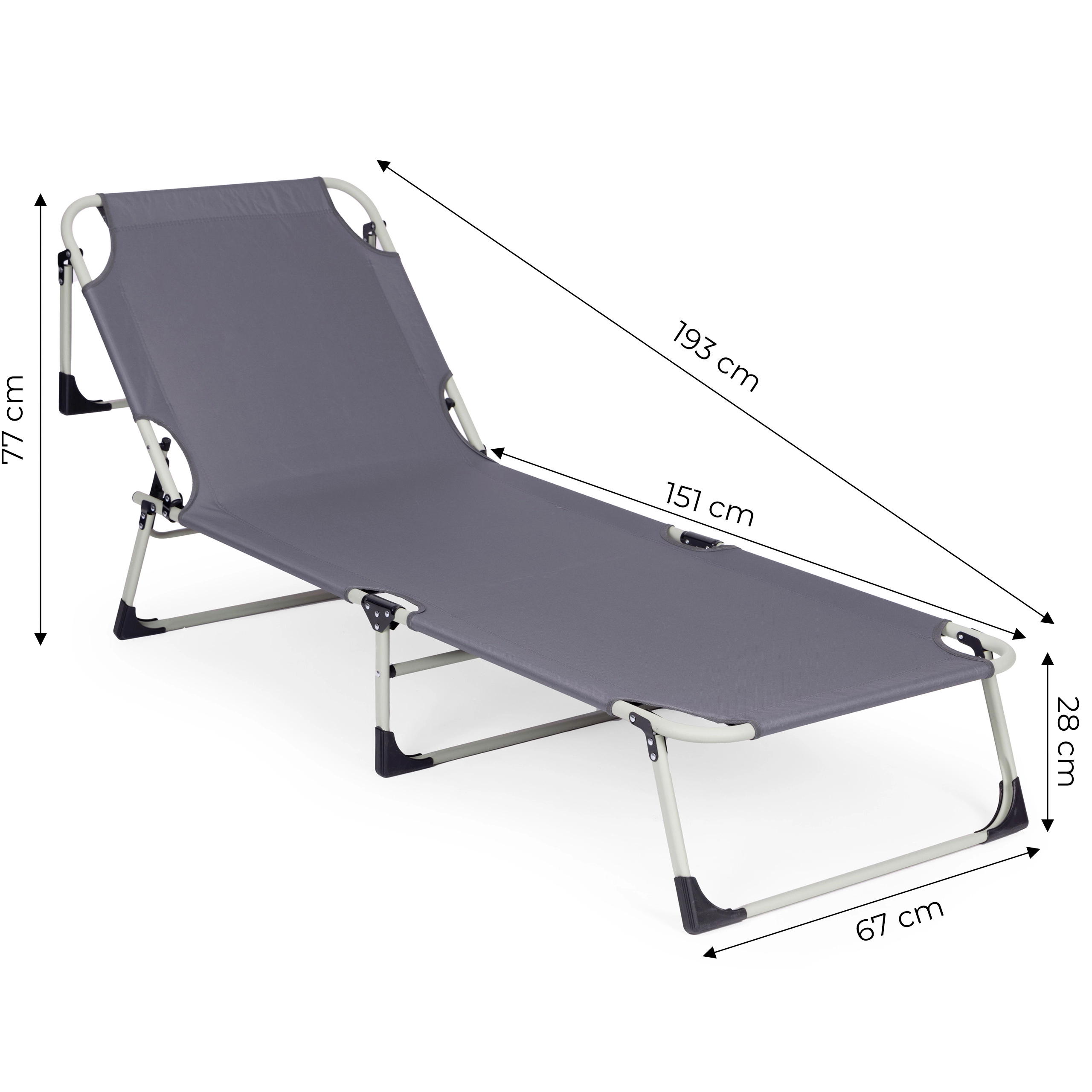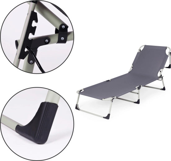 Cadrul rezistent din metal vopsit în câmp electrostatic și tălpile antiderapante asigură stabilitate pe diverse suprafețe. Husa din material Oxford 600D este ușor de întreținut și pregătită pentru utilizare în aer liber. Datorită construcției pliabile, șezlongul se pliază rapid pentru depozitare sau transport.