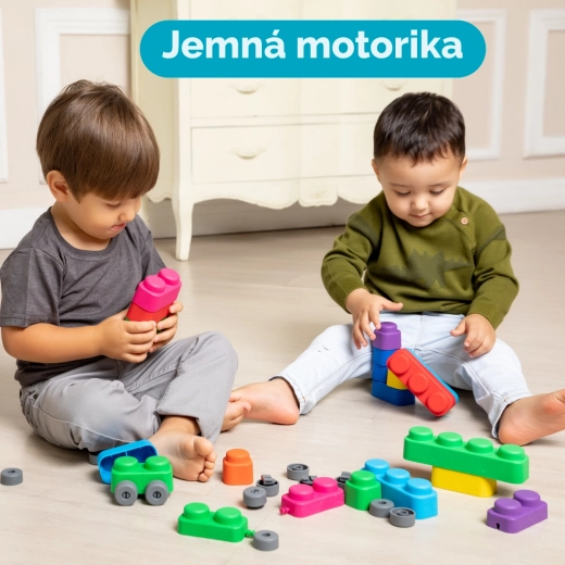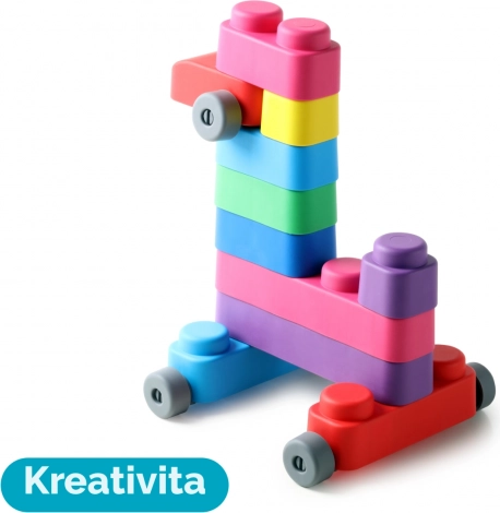 Far Far Land set de construcție moale cu 15 blocuri și 12 rotițe pentru dezvoltarea creativității și abilităților motorii ale copiilor.