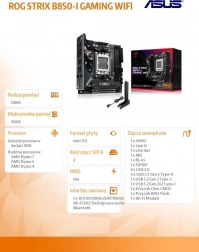 ROG STRIX B850-I GAMING WIFI îmbină cele mai noi tehnologii într‑un format mini‑ITX minimalist. Datorită suportului PCIe 5.0 pentru plăci grafice și stocare NVMe, memoriilor DDR5 rapide și etapelor de alimentare performante, obțineți o platformă pregătită pentru jocuri moderne, creație de conținut și sarcini de lucru AI.