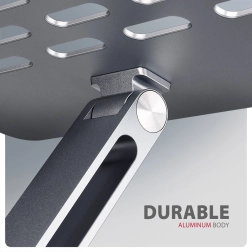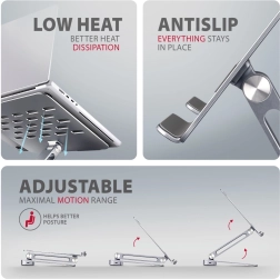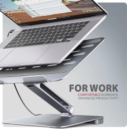 Construcția elegantă și durabilă din aliaj de aluminiu asigură răcire pasivă și stabilitate, în timp ce suprafețele antiderapante protejează dispozitivele împotriva zgârierii. Suportul cu articulație dublă permite reglarea precisă a înălțimii până la 205 mm și a unghiului de înclinare, astfel încât ecranul să fie aliniat cu monitorul extern. Hub-ul extinde laptopul cu HDMI 4K/60 Hz, 3x USB-A 5Gbps, RJ‑45 Gigabit și intrare USB‑C PD 100 W.