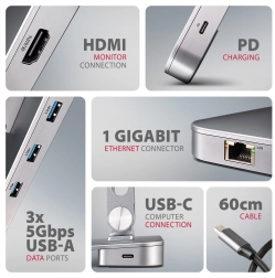 Ieşirea HDMI suportă până la 4K/60 Hz, 2K/120 Hz și 1080p/200 Hz, inclusiv HDR și sunet multicanal. USB-A 5Gbps deservește unități externe (până la două simultan), periferice și încărcare până la 7,5 W. Gigabit Ethernet asigură o conexiune de rețea stabilă, iar prin USB‑C PD 3.0 poți încărca laptopul cu până la 100 W. Conectarea este ușoară datorită Plug & Play și Hot Plug.