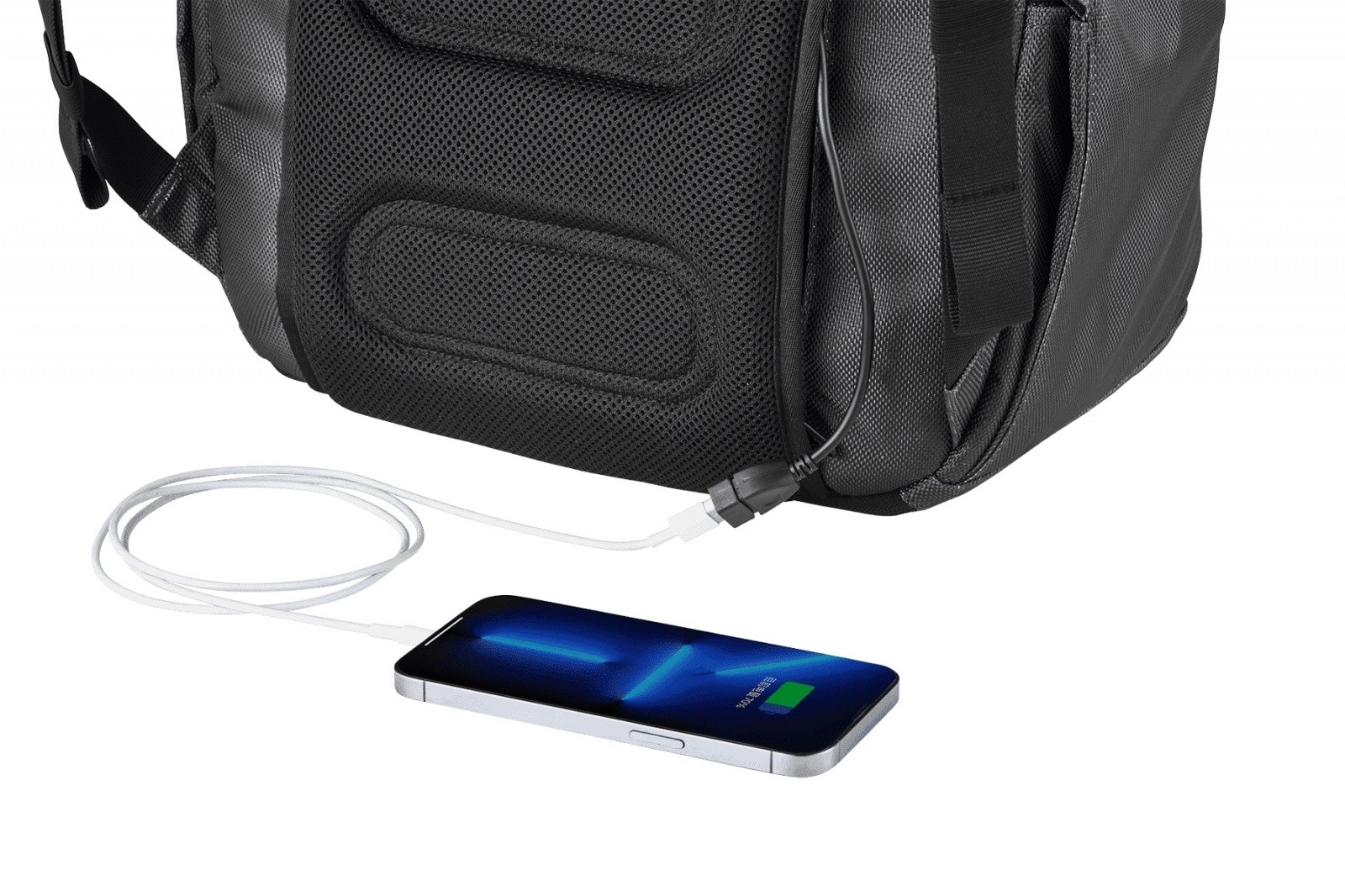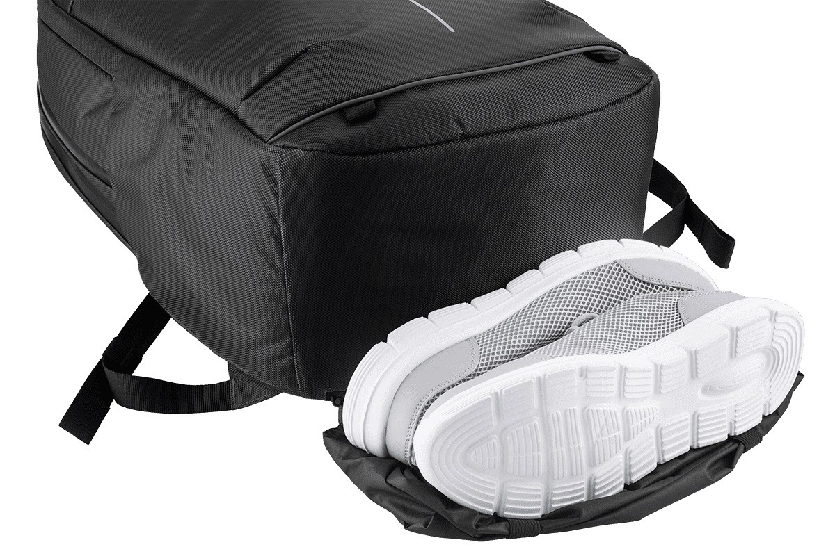 Încarcă telefonul în mers datorită portului USB și ajustează capacitatea rucsacului de la 26 la 30 de litri. Buzunarul inferior este ideal pentru pantofi sau obiecte ude.