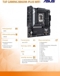 ASUS TUF GAMING B860M‑PLUS WIFI se bazează pe chipsetul Intel B860 și oferă alimentare robustă, răcire de calitate și durată de viață îndelungată. Datorită suportului pentru memorie DDR5 până la 8800 MHz și capacității maxime de 256 GB, asigură rulare fluidă a jocurilor solicitante, multitasking și aplicații creative.