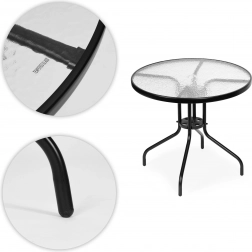 Blatul rotund cu diametrul de 80 cm oferă suficient spațiu pentru până la patru persoane. Construcția specială a cadrului garantează stabilitate și rezistență atât la greutate, cât și la utilizarea umbrelei.