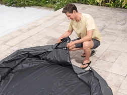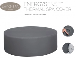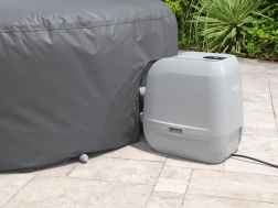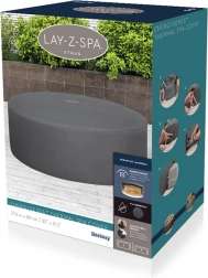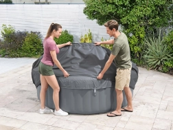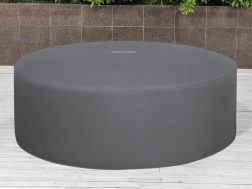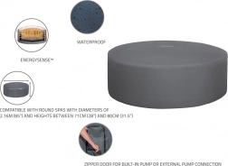 Montajul este rapid și intuitiv. Cureaua circumferențială ajustabilă cu cleme de siguranță asigură o fixare fermă, în timp ce fermoarul integrat permite conectarea fără probleme la pompă fără a fi nevoie să scoateți husa. Husa este compatibilă cu modelele Lay‑Z‑Spa St. Moritz, Monaco, Santorini HydroJet Pro și alte căzi rotunde cu diametrul de 216 cm.