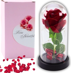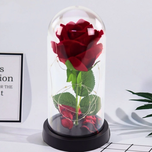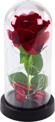 Iluminarea LED accentuează fin frumusețea trandafirului și creează o atmosferă călduroasă, ideală pentru decorarea interioarelor și momentele romantice. Petalele delicate ale trandafirului plutind în cupolă adaugă eleganță și romantism întregii compoziții.