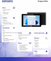 Tabletul Krüger & Matz EDGE 1089 este dispozitivul ideal pentru utilizarea zilnică. Procesorul său dual-core Intel Celeron N4020 cu frecvență de până la 2,8 GHz asigură funcționarea fluidă a diferitelor aplicații. Cu 4 GB memorie RAM și 128 GB stocare internă aveți suficient spațiu pentru fișierele și aplicațiile dumneavoastră.