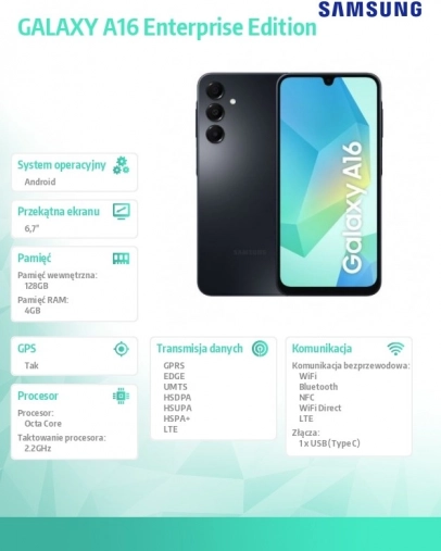 Samsung Galaxy A16 LTE Enterprise Edition, 4 GB RAM și 128 GB, negru. Performanță fiabilă, administrare pentru firme și suport extins. Ideal pentru muncă și utilizare zilnică.