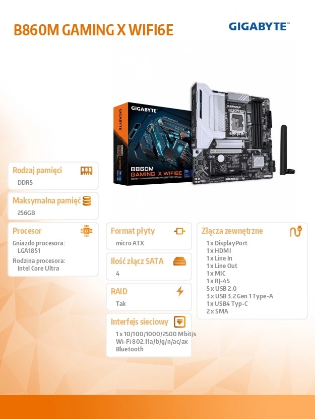 Placă de bază mATX compactă pentru cele mai noi procesoare Intel Core Ultra (a 2-a generație) oferă VRM performant 8+1+2 faze, stocare ultrarapidă M.2 PCIe 5.0 x4, Wi‑Fi 6E integrat și LAN 2,5GbE. Montajul ușor este asigurat de mecanismele fără șuruburi EZ-Latch, iar răcirea excelentă de VRM Thermal Armor Advanced și M.2 Thermal Guard. Conectivitatea amplă, inclusiv USB4 Type‑C cu DP‑Alt, HDMI și DisplayPort, va mulțumi atât gamerii, cât și utilizatorii exigenți.