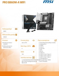 Placa de bază compactă și performantă MSI PRO B860M-A WIFI pentru socket LGA 1851 oferă suport pentru procesoare Intel Core Ultra, memorie rapidă DDR5, conectivitate PCIe 5.0 și M.2, răcire de top Frozr Guard și tehnologii moderne de rețea, inclusiv Wi‑Fi 7, 5G LAN și Thunderbolt 4. Datorită designului bine gândit EZ DIY și funcțiilor Core Boost, Memory Boost și Audio Boost, obții performanță stabilă, asamblare ușoară și sunet curat atât pentru lucru, cât și pentru gaming.