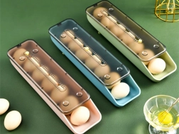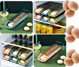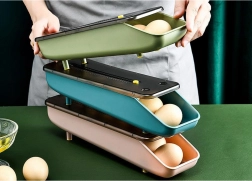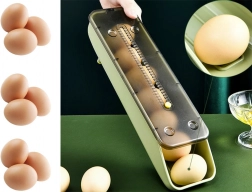 Fără cutii instabile și ouă sparte. Acest rezervor inteligent pentru ouă, cu capac glisant, menține ouălele în siguranță la locul lor și, datorită pantei, după ce scoateți un ou, următorul se deplasează automat spre față. Glisorul integrat pentru dată vă ajută să marcați ziua introducerii sau a consumului, astfel încât să aveți prospețimea mereu sub control.