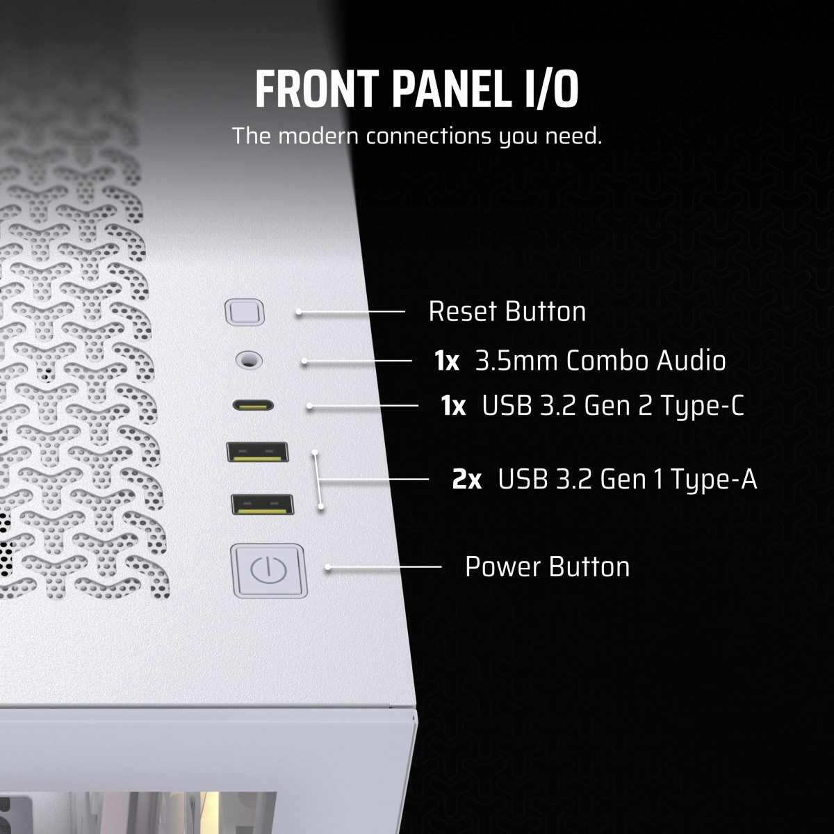 Panoul frontal include un port USB 3.2 Gen 2 Type-C, două porturi USB 3.2 Gen 1 Type-A și o combinare audio și intrare microfon.