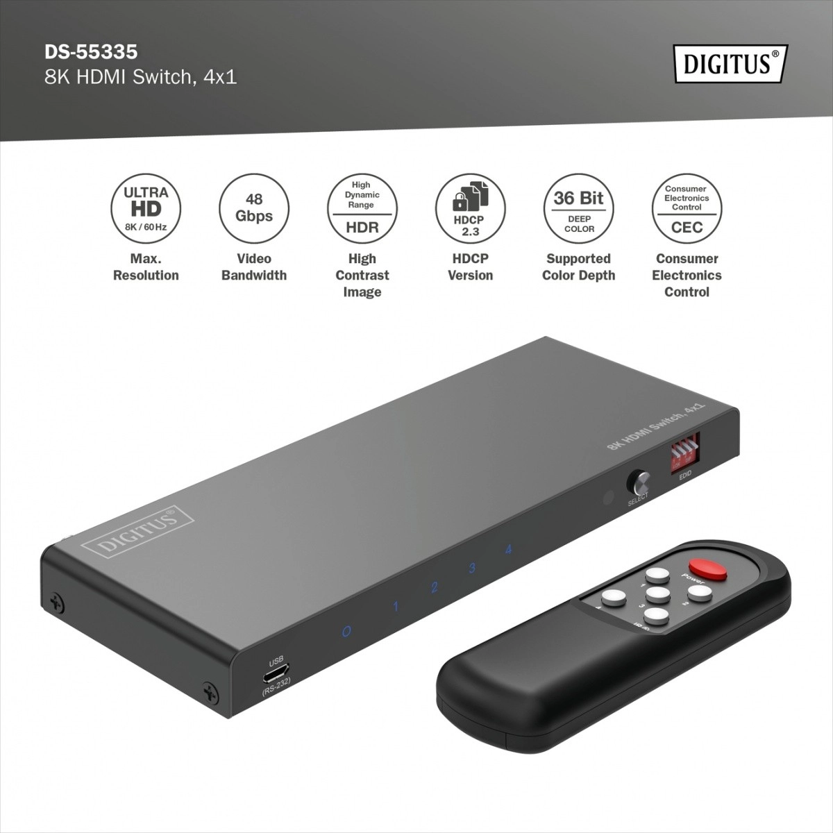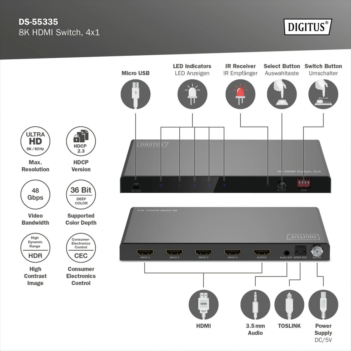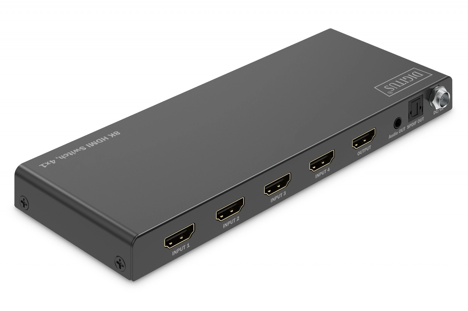 Comutator Digitus 8K HDMI, 4x1 vă oferă patru intrări HDMI suplimentare pentru monitorul sau televizorul dumneavoastră, permițând conectarea comodă a diverselor surse cu o singură ieșire HDMI. Semnalele audio pot fi, de asemenea, separate folosind ieșirea Toslink sau stereo și redate separat.