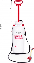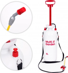 Pompă de stropit sub presiune, practică, cu volum de 8 l de la marca MULTIGARDEN, pentru îngrijirea comodă a grădinii și curățenia în jurul casei. Oferă duză reglabilă (jet plat și pulverizare conică), lance lungă din fibră de sticlă, pompă cu piston, supapă de siguranță și scară gradată pe rezervor. Datorită mânerului ergonomic și curelei reglabile, pompa se poartă și se manevrează confortabil.