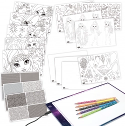 Tabletă, cablu USB, 5x creion colorat cu două capete, 1x marker negru, foi inspiratoare