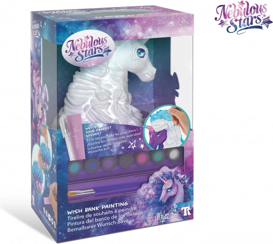 Nebulous Stars Pușculiță pentru dorințe. Set, pictează-ți propria pușculiță pentru dorințe. Conținutul pachetului – pușculiță, 7 vopsele acrilice, lac sclipitor, 2 pensule, 75 pietricele, mini pix gel, mini jurnal, instrucțiuni.
