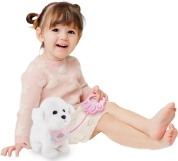 Acest cățel de pluș moale și prietenos, cu înălțimea de 22 cm, aduce multă bucurie copiilor datorită mișcărilor și sunetelor realiste. Cablu cu telecomandă se conectează în orificiul de la gât și permite control facil al mersului și efectelor. Datorită combinației dintre atingere, bătut din palme și butoane, joaca este intuitivă și distractivă.