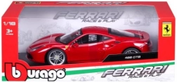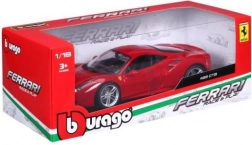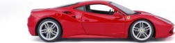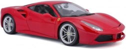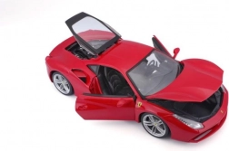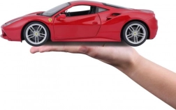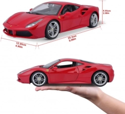 Execuție detaliată a Ferrari 488 GTB roșu, cu proporții autentice, sigle și roți sport la scara 1:18.