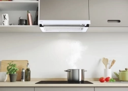 Hota telescopică cu design alb stilat se potrivește perfect în orice bucătărie modernă.