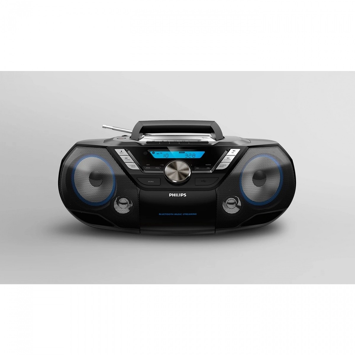 Sistem portabil cu sunet bogatRadiocasetofonul Philips este un sistem audio portabil versatil și puternic, ușor de luat cu tine. Permite redarea muzicii din diverse surse: Bluetooth, USB, CD, casete, DAB+ și radio FM.